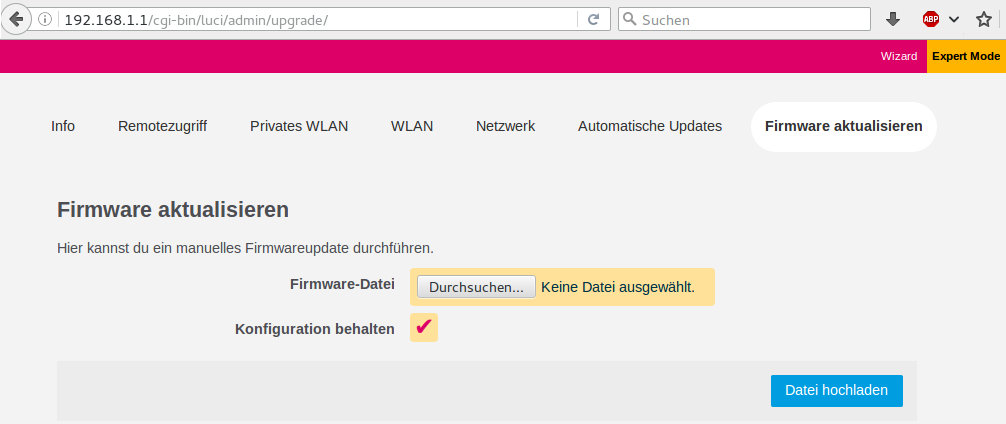 und das vorher heruntergeladene Sysupgrade-Image hochladen.